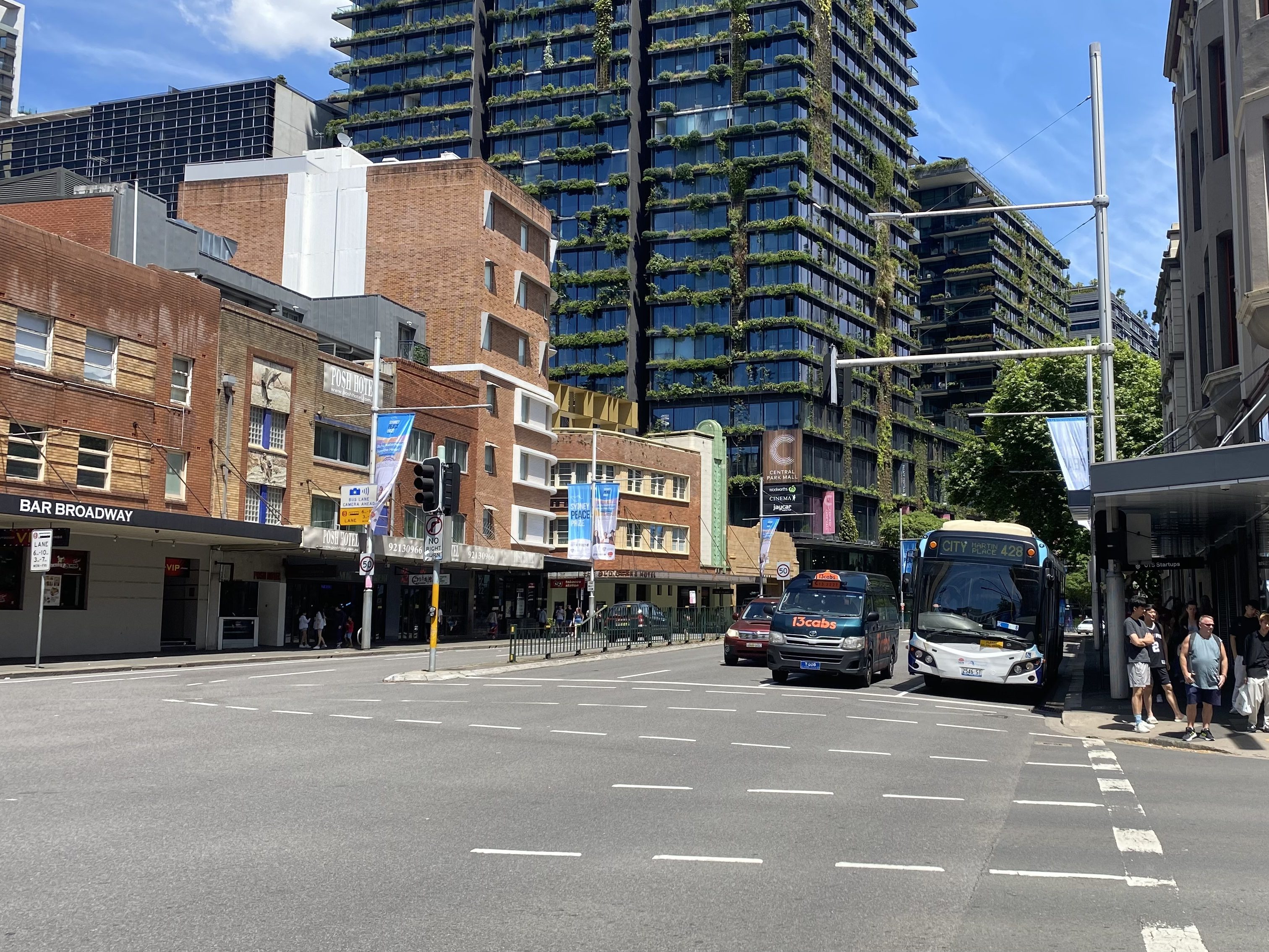 As Harris St was a multi-lane one-way, the driving experience can feel similar to a highway and encourage high speeds and aggressive driving behaviour (e.g. jockeying). The massive width of Broadway also has a similar effect.